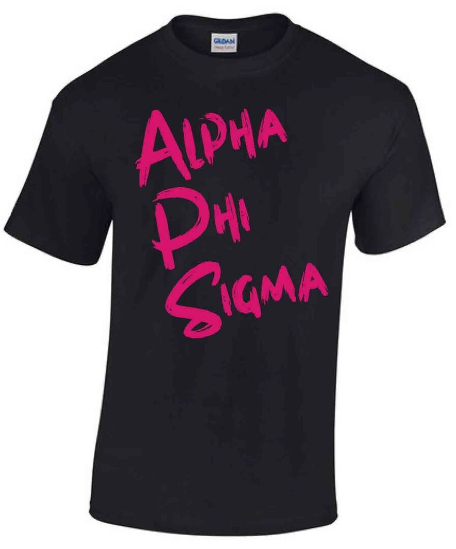 Alpha Phi Sigma Pink Graffiti T-Shirt Color: Black with hot pink lettering If you’re looking to add some personality and flair to your wardrobe, don’t look any further. This stunning t-shirt hits hard and lets everyone know you belong to APS! Fabric: 100% preshrunk cotton Features: Seamless rib at neck Taped shoulder-to-shoulder Double-needle stitching throughout Tear-away label Quarter-turned to eliminate center crease 7/8″ collar Classic fit